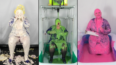 She begins taking several measurements, fastidiously writing down her findings on the form on her clipboard. She then gets to her favourite part of the test, taking her seat in the gunge tank. She pulls the trigger, letting luminous yellow and dark green gunge cascade over her body. She moves with purpose under the column of gunge, covering herself and her outfit with the warm mess. She fills the sleeves and pockets of her blazer, and rubs the colourful gunge over her white top. Pushing her legs together, gunge runs down her stockings and over her shoes. As the column of thick gunge slows to a drip, she takes a look down at the colourful mess she has become.
